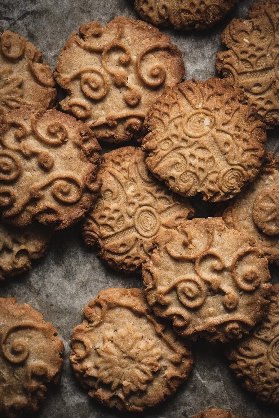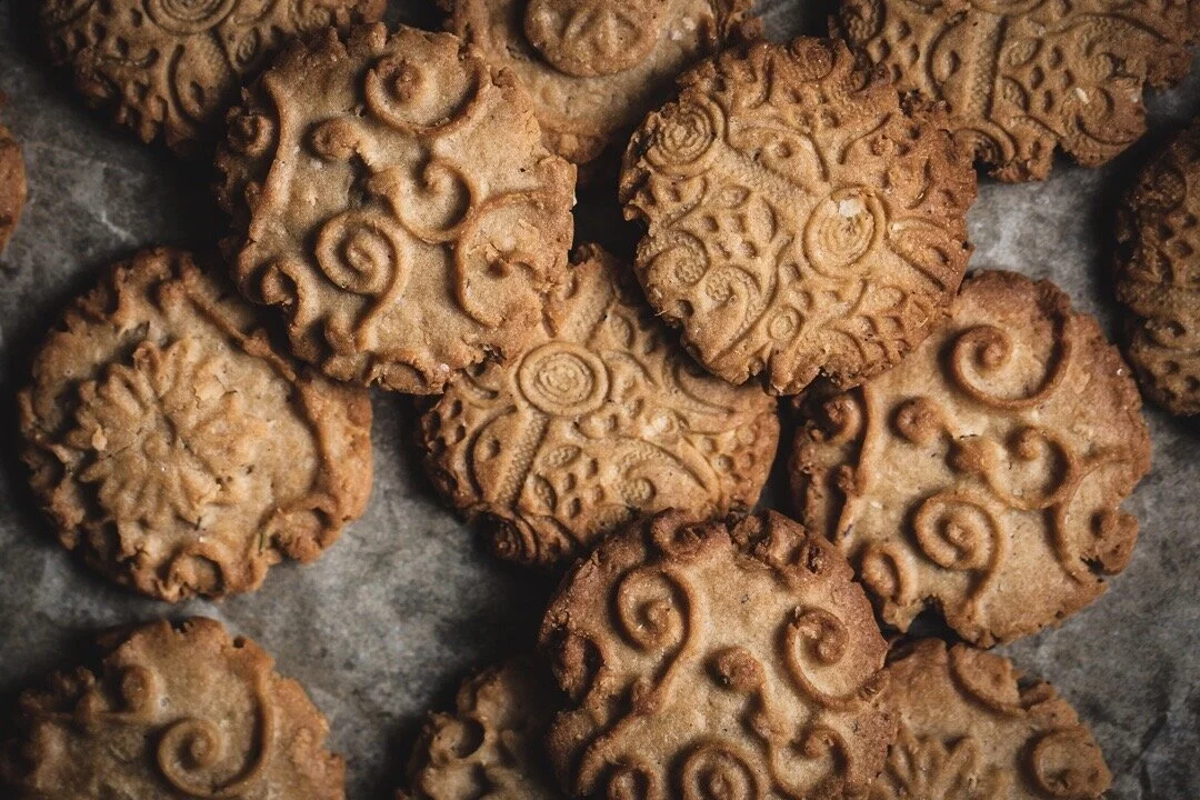 After the dough has rested, break off about 30 equal-sized portions and roll them into balls. Use a greased thekua mold or the bottom of a patterned glass to press them flat (about 4” wide and 1/8” thick). Alternately, you can flatten the cookies between your palms and use a fork or toothpick to make patterns on the surface if you like. Place the cookies 2” apart on the lined baking tray.