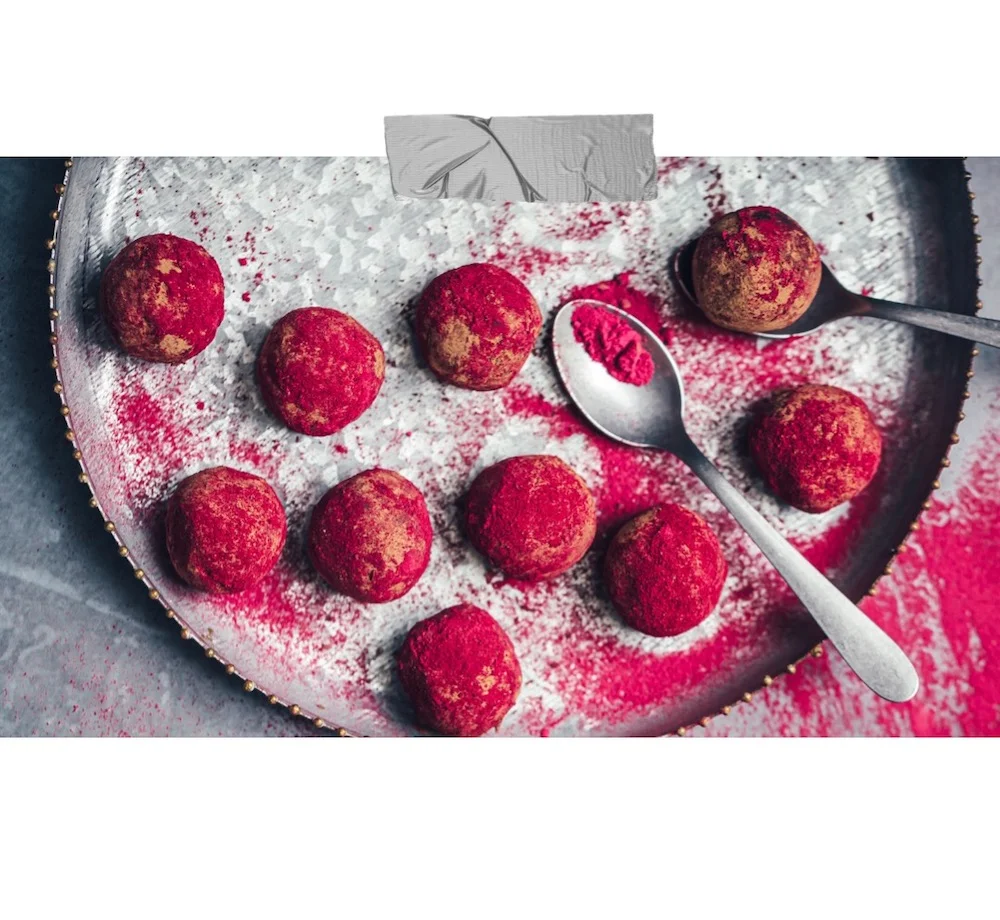 Form equal-sized portions of the dough into balls and roll them in cocoa or beetroot powder.