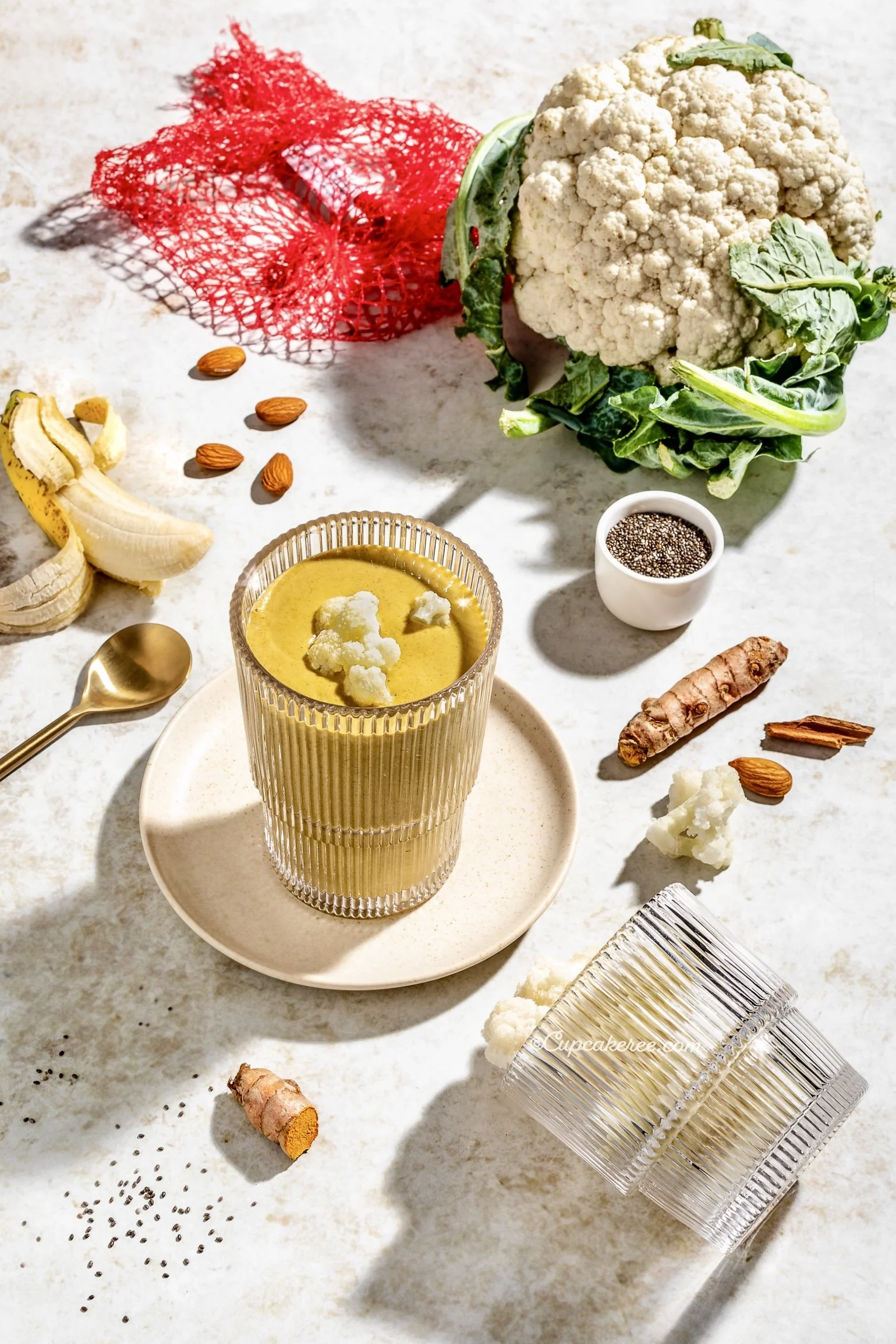 To make my mornings easier, I prep the cauliflower ahead. I chop a head of cauliflower into florets and blanch them in boiling water with a pinch of baking soda (to get rid of any lurking grubs). I then lightly steam the florets, dry them on a kitchen towel and freeze them on a baking tray. Once they are individually frozen, I transfer them into a ziplock bag and store them in the freezer. That way I can grab a few whenever I need to. I prefer freezing cauliflower (instead of bananas) because cauliflower does not turn brown over time.