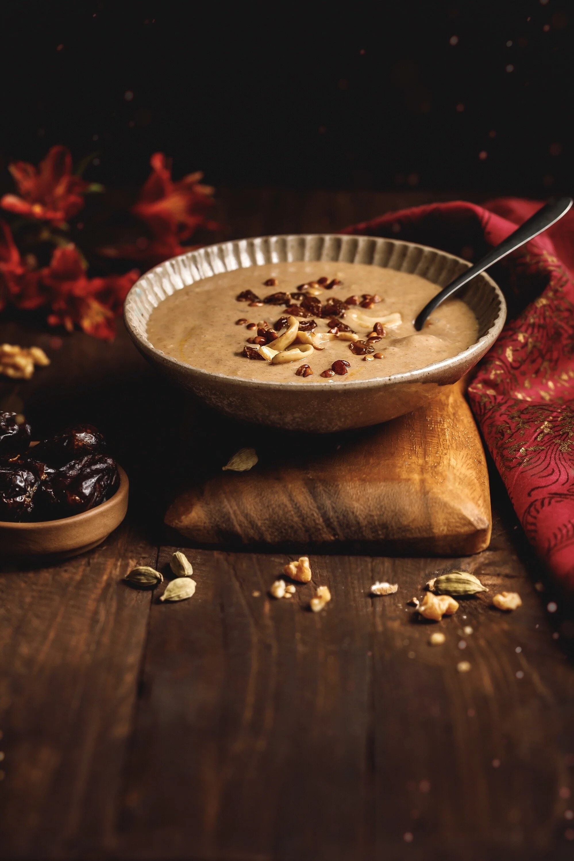 I made this dessert for my mum. She is finally flying home today (after an unplanned and extended six-month long stay in Delhi). She is always a bit skeptical about my kitchen experiments, so I hope she likes it. This pudding is rich, wholesome and naturally sweetened only with dates. It is also gluten-free, grain-free and best served warm. Check the note at the end of the recipe for vegan substitutes.