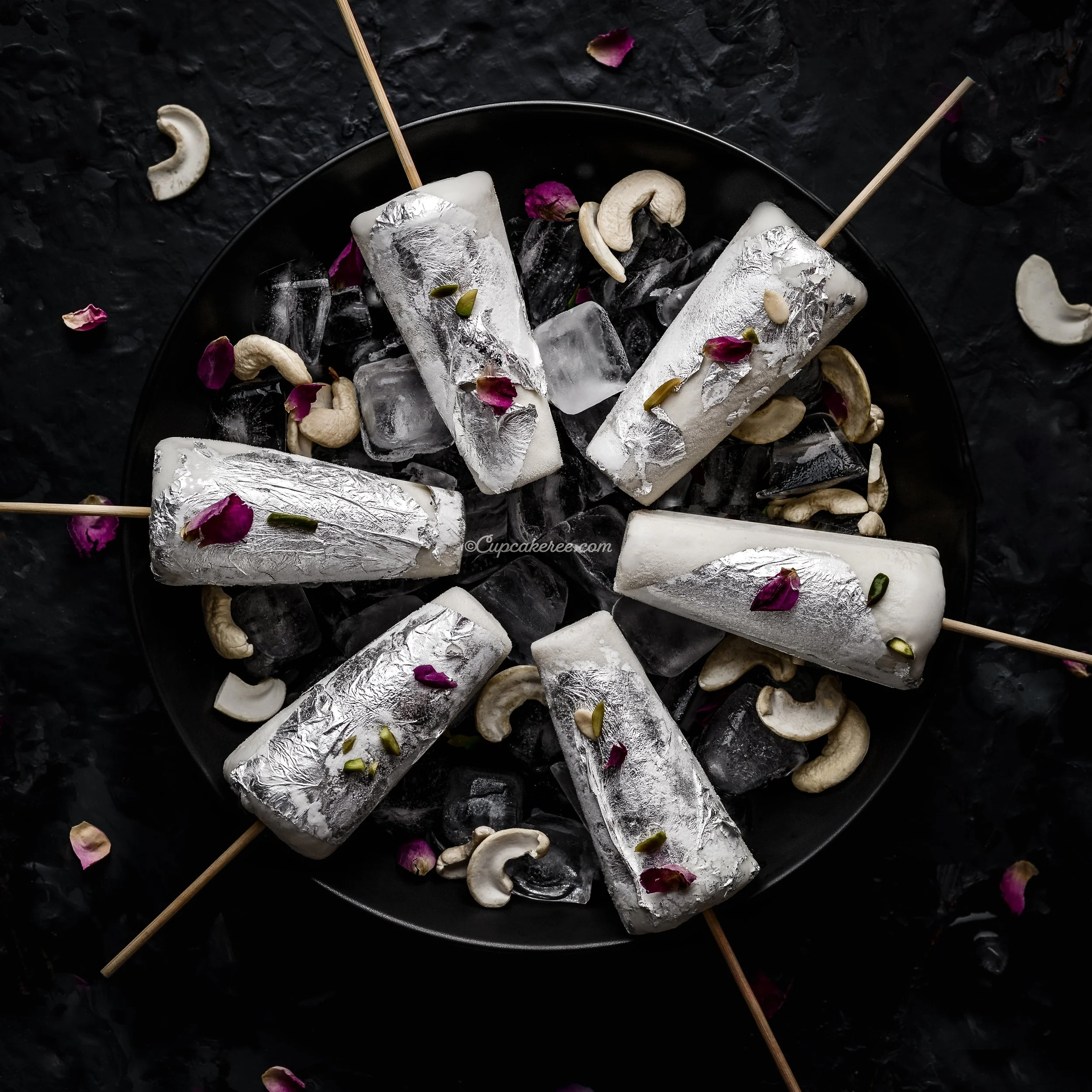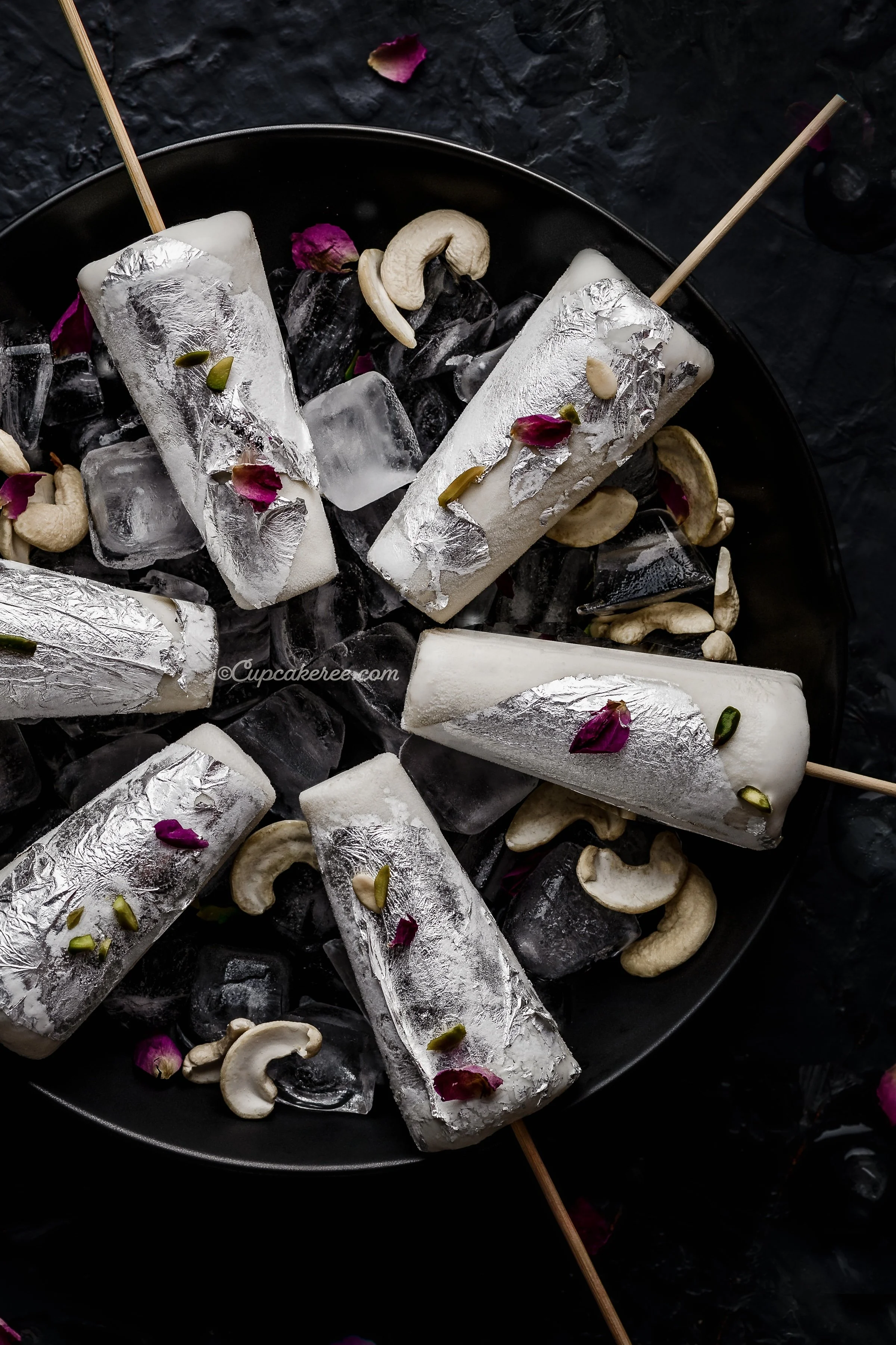 I made and photographed this recipe for a client last year. Sharing it here today because it’s perfect for the festive season and who doesn’t love a luscious kulfi, no matter what the weather. I made two separate batches (with erythritol and sugar) and both turned out well. Because of its cool aftertaste, I find erythritol works better in cold desserts. FYI, sticking the edible silver leaf (warq) on the cold kulfis was a legit pain. I did it for the photos, but I don’t recommend it. The kulfis taste just as good without it.