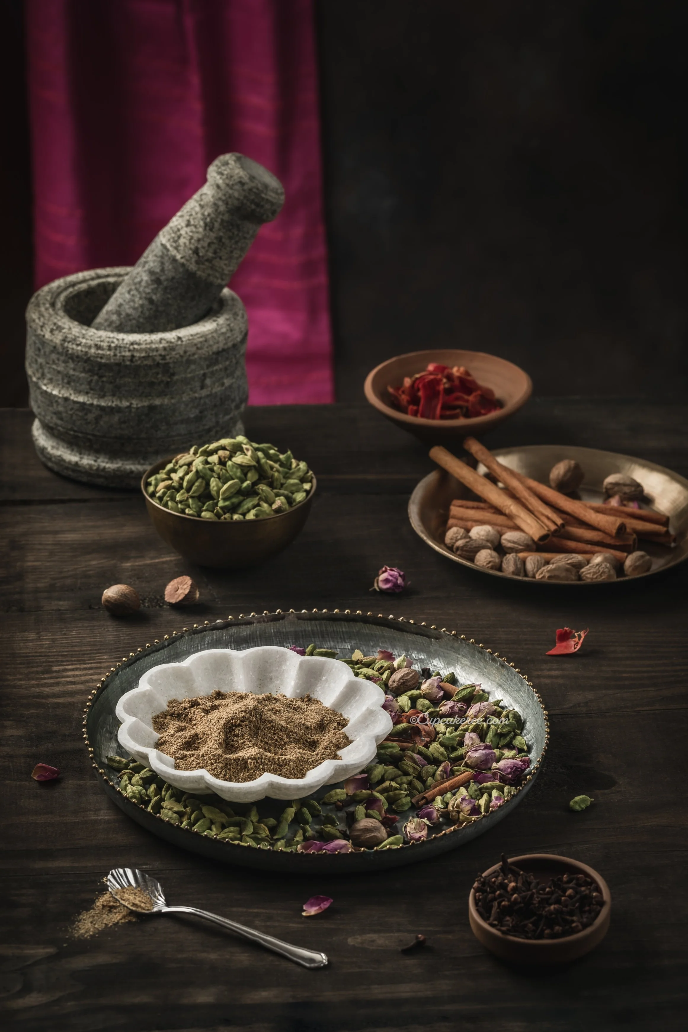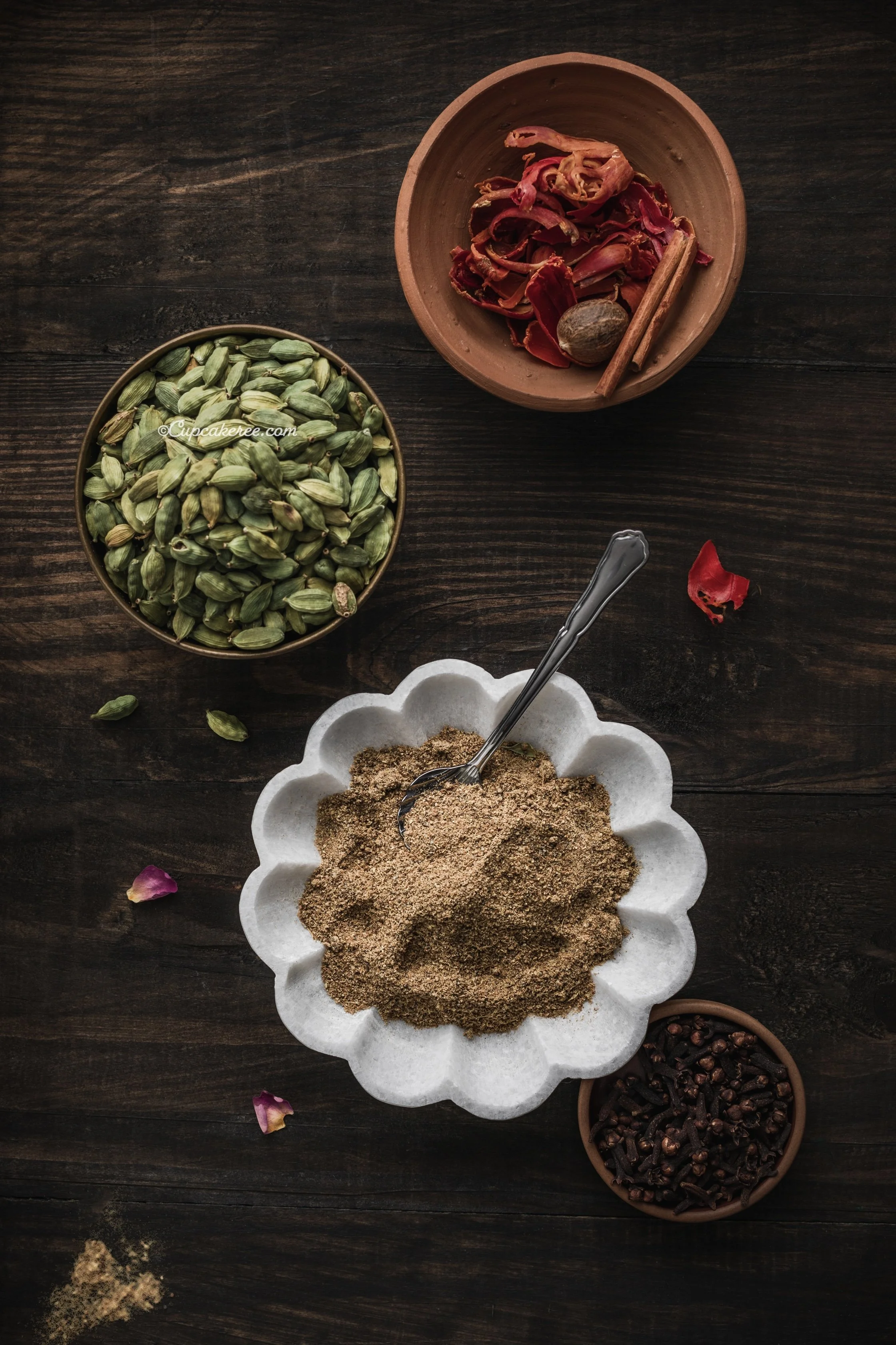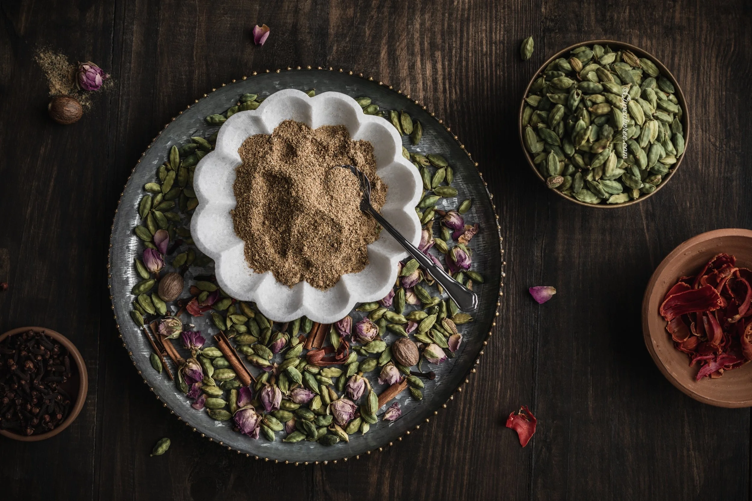 In a small frying pan, dry roast the spices and dried rose petals over low heat for 2-3 minutes (this is to remove the extra moisture, not for browning the spices).