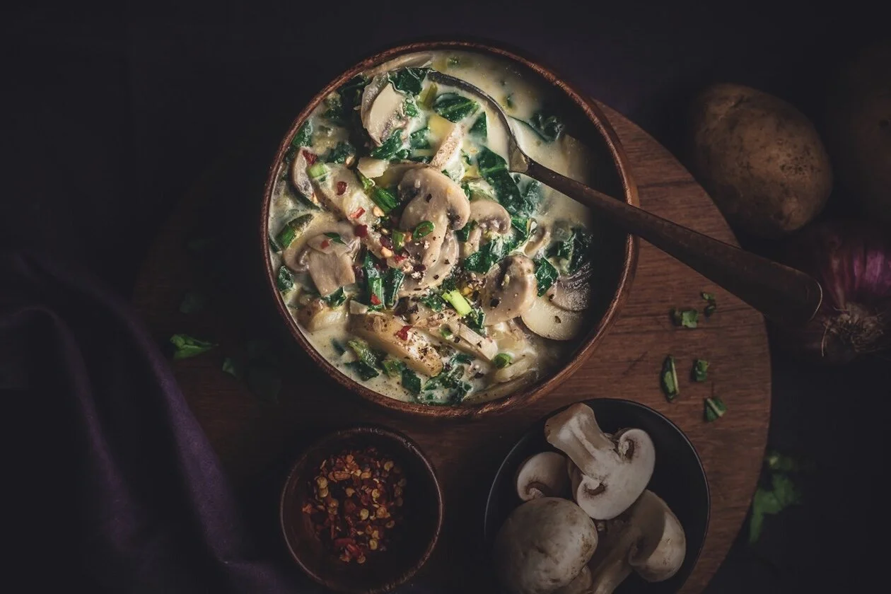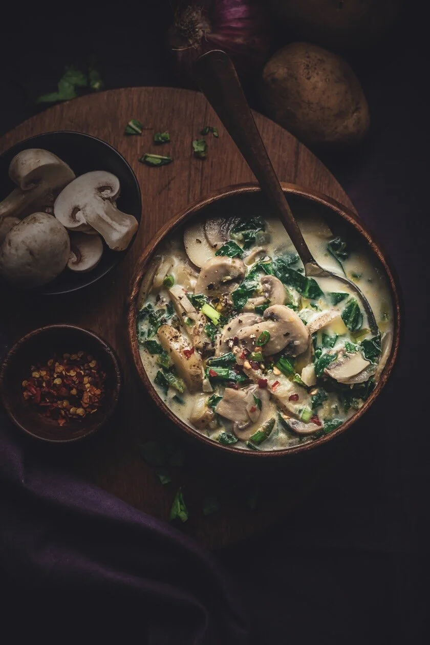 It has been raining every single day and a warm, hearty stew is what I have been craving post the Diwali sugar rush. This mushroom and potato soup is a family favorite. It is a recipe I make often, using any greens I have on hand. The coconut milk adds a creamy richness and the vegetables make it filling. It is comfort food at its soul-satisfying best.