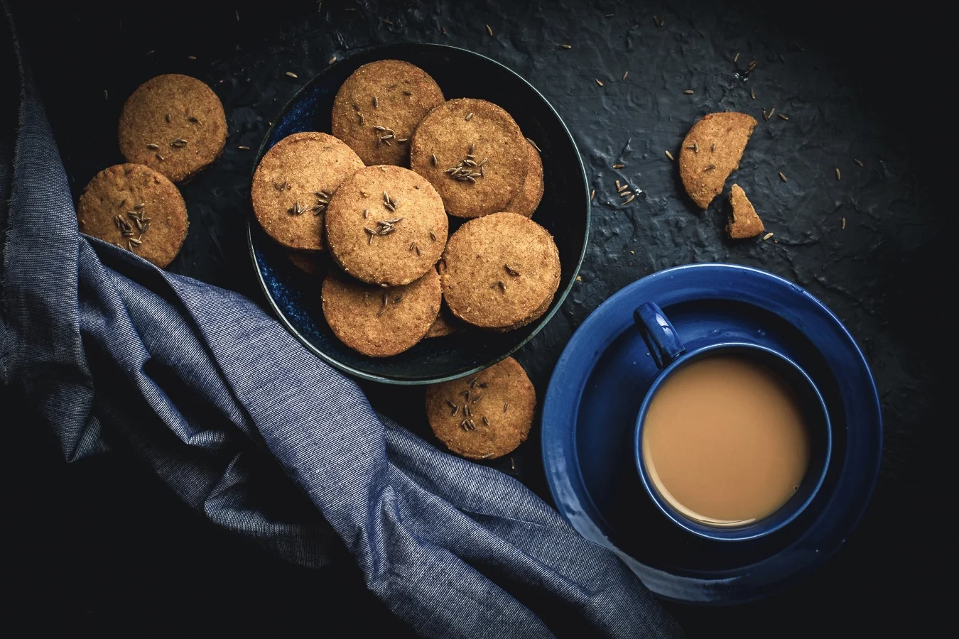 Once chilled, take small portions of the dough and roll them out to 1/4” thickness. Use a 2” round cookie cutter to cut out a biscuit and place it on a parchment-lined plate. Proceed to do this until all the dough is used up. Sprinkle the biscuits with some cumin seeds if you like.